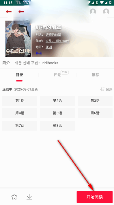 ① 首页/分类/搜索点封面 → 进入详情页 → 点「开始阅读」默认下拉式;右上角可切换「翻页式」