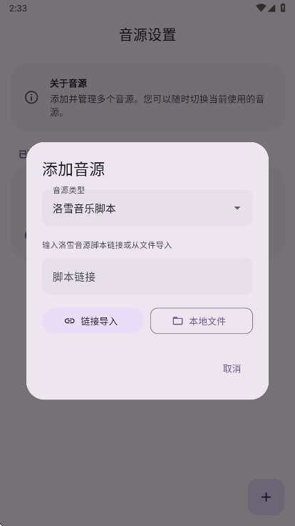 我的 → 歌单 → 右上角「+」→ 选择对应平台(网易/QQ/酷我)→ 粘贴歌单链接或 ID → 确认后自动拉取,如提示平台不符,先在“设置-音源名字”切到对应源再重试。