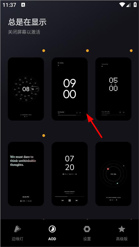 进入底部“设置”→ 总是在显示 → 开启“关闭屏幕时显示”,即可在锁屏后继续看到边缘灯效,同页面还能选息屏表盘样式。