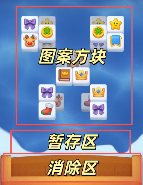 每关会叠加不同图案的方块,可以点击最上层的图案移动到下方消除区,消除区存在三个相同图案方块会进行消除,所有方块消除就能过关。