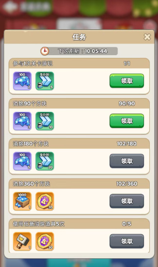 每天完成任务可以领取任务奖励,打不够还可以购买助力礼包,内含消除道具