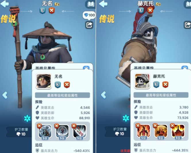 1.从属性上来看,无名满星可以增加540.43%的盾兵攻击力和防御力。赫克托可以增加盾兵444.035%的盾兵攻击力和防御力。这在属性面板上就差距了100多的加成。