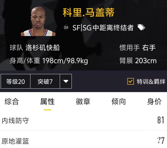兼具投射和冲框的光头锋线,可能会给几个终结方面的徽章,但是整体应该实用性因人而异的球星,虽说是有几枚投射徽章,但是如果热区按照端游来的话,那投三分还得先背一下马盖蒂的热区分布,回归到这种卡的本质,有冲扣但是没有相关的扣篮徽章,有投射但是外线冷区多,中投无热区(除非魔改),并且运球速度慢的一个球员。